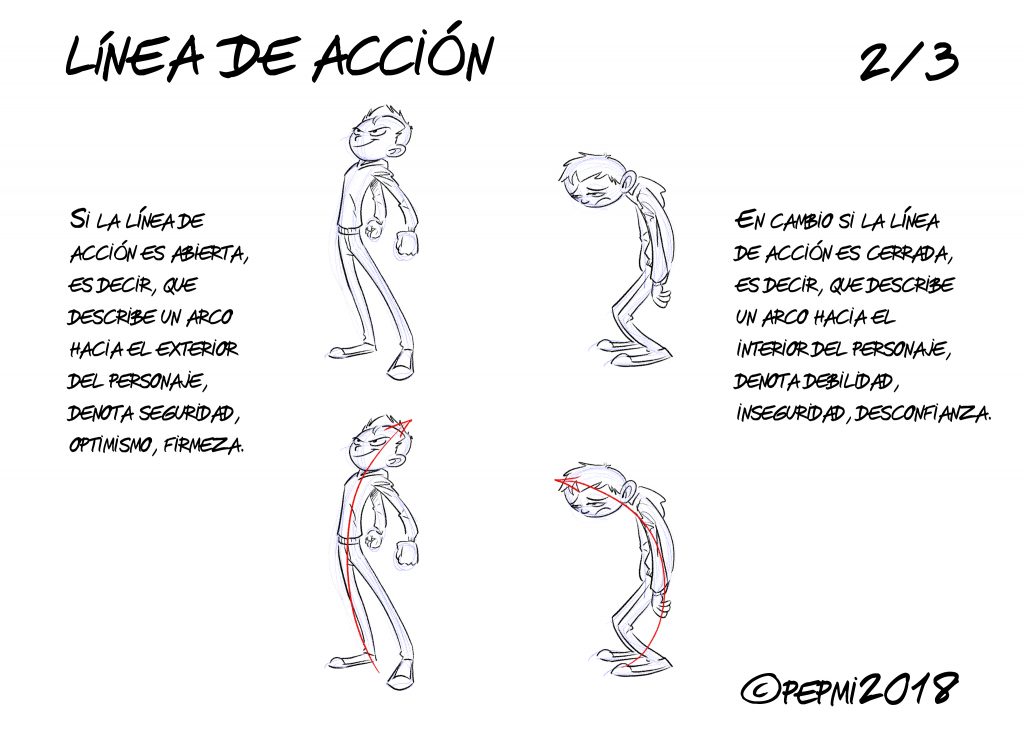 Tener un personaje atractivo no sirve de nada si luego no sabemos utilizarlo para expresar emociones. Para esto, un recurso muy útil es tener en cuenta la LÍNEA DE ACCIÓN. La línea de acción es la línea imaginaria que describe el cuerpo y va desde los pies hasta la cabeza.